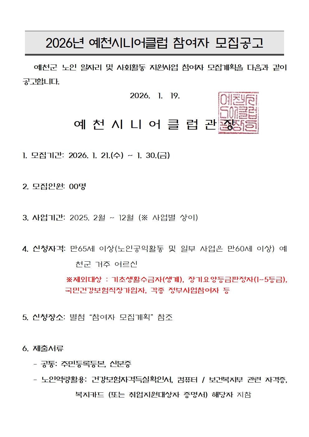 2026년 예천시니어클럽 노인일자리 참여자 추가모집 페이지 정보 작성자 관리자 작성일26-01-21 09:42 조회182회 댓글0건 본문 댓글목록 등록된 댓글이 없습니다. 이전글 다음글 목록