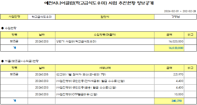 2026년 2월 예천시니어클럽(학교급식도우미) 정보공개 페이지 정보 작성자 관리자 작성일26-03-12 11:17 조회33회 댓글0건 본문 댓글목록 등록된 댓글이 없습니다. 다음글 목록